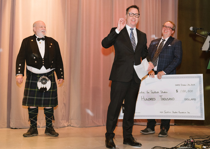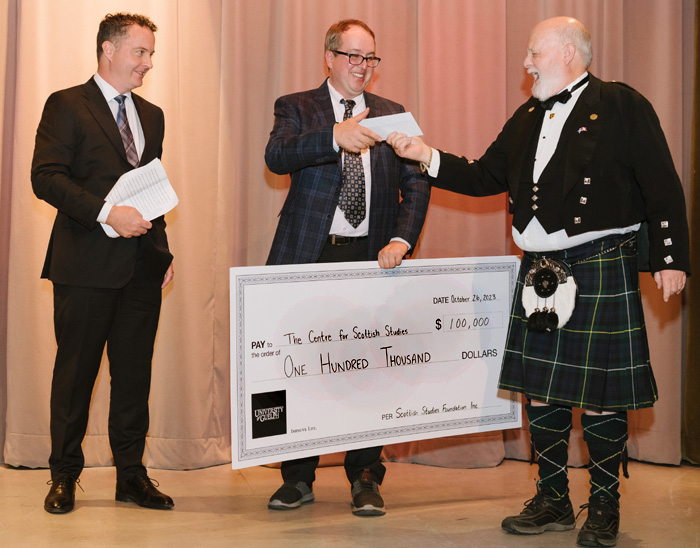 Professor Kevin James thanks the Scottish Studies Foundation for the $100,000 donation which will be added to its existing large and growing endowment fund to provide critical assistance to students and encourage scholarship for generations to come.