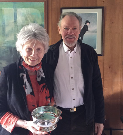 Alice Munro is pictured above with the actual award (a large silver quaich) being presented to her by Doug Gibson on Sunday, May 15. The photo was taken at her home in Clinton, near Goderich, Ontario. In the background we can see the famous Raeburn painting of the Edinburgh minister, Reverend Robert Walker, skating on Duddingston Loch in a prim, presbyterian way.