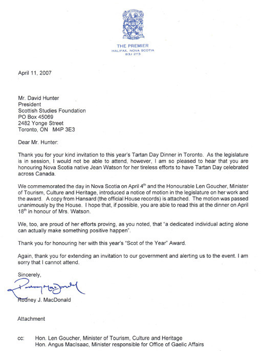 Letter from Nova Scotia Premier, The Hon. Rodney J. MacDonald