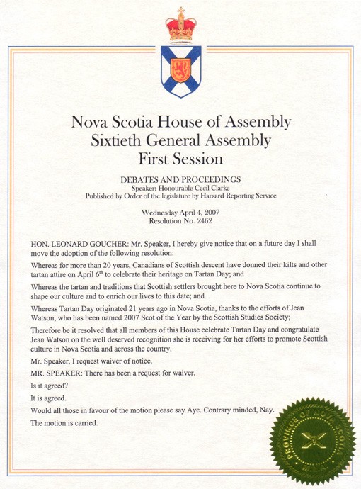 Thanks to the efforts of Jean Watson, Tartan Day April 6th, has become a yearly event not only in Canada but all over the world.