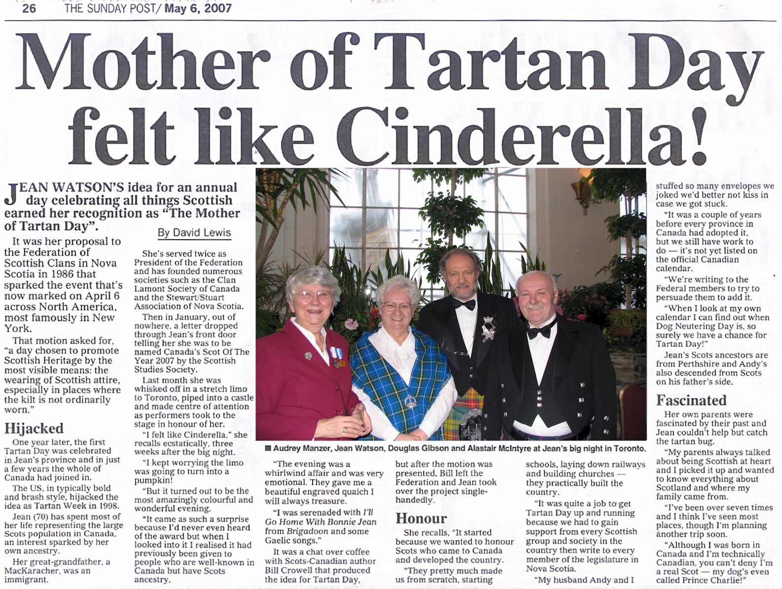 It gives us great pleasure to announce that Jean became "Scot of the Year 2007" at the Scottish Studies Society's Tartan Day Dinner at Casa Loma in Toronto on 18th April 2007.