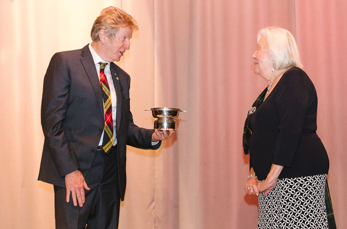 Maggie McEwan presents R. H. Thomson with the award — a specially engraved quaich.